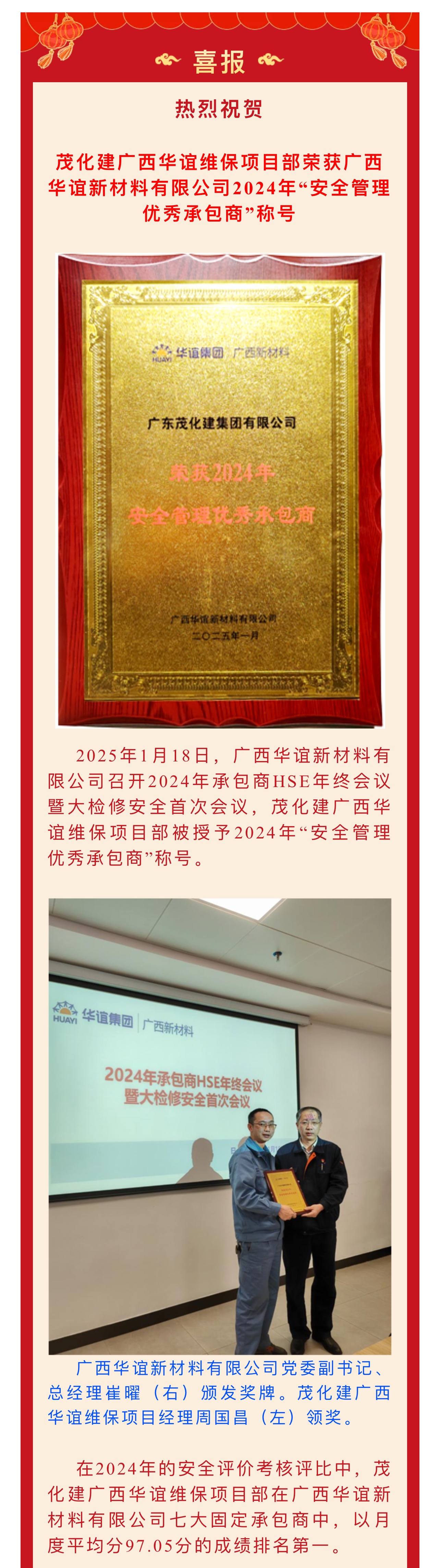 喜報|榮獲廣西華誼2024年“安全管理優(yōu)秀承包商”稱號